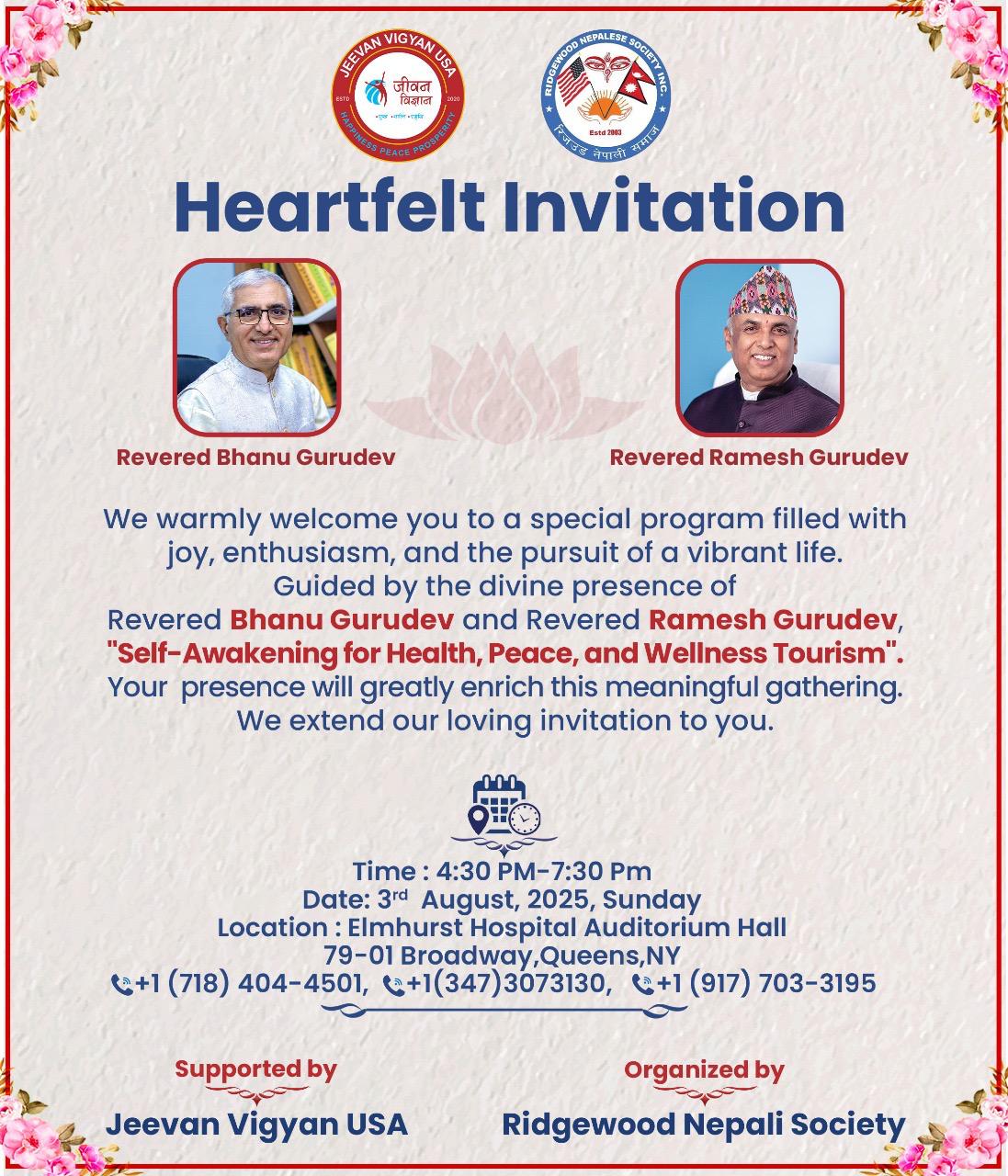 न्यूयोर्क- जीवन विज्ञान अमेरिका र रिजउड नेपाली समाजको संयुक्त आयोजनामा आगामी अगस्ट ३, २०२५ (आईतवार) को दिन “स्व-प्रबोधन : स्वास्थ्य, शान्ति र वेलनेस पर्यटन” विषयमा केन्द्रित एक विशेष कार्यक्रम आयोजना हुने भएको छ।