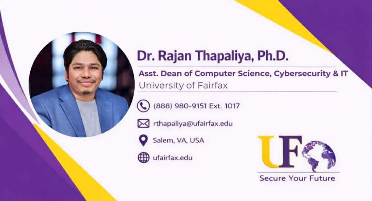 University of Fairfax ले नेपाली मूलका डा. राजन थपलियालाई कम्प्युटर साइन्स, साइबर सुरक्षा तथा सूचना प्रविधि विभागको सहायक डीन पदमा नियुक्त गरेको छ। उनले फेब्रुअरी १५, २०२६ देखि आफ्नो नयाँ जिम्मेवारी सम्हालेका हुन ।