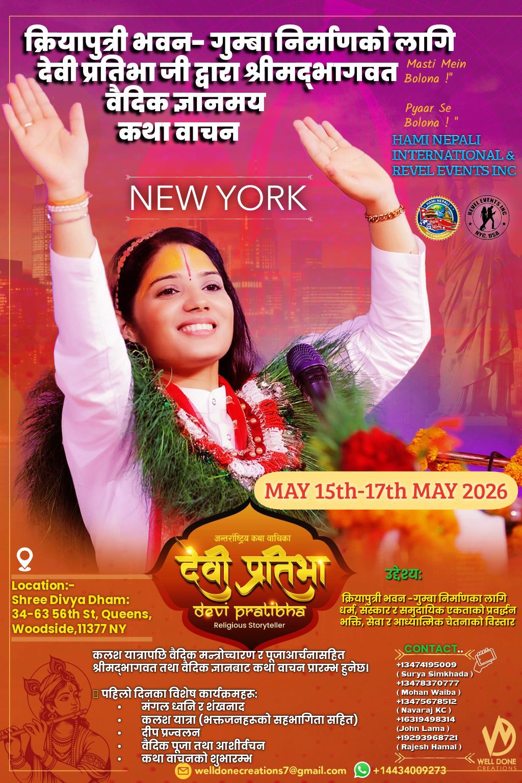 कथा वाचन कार्यक्रम आउँदो मे १५ देखि १७ तारिखसम्म चल्नेछ। यो धार्मिक कार्यक्रम न्युयोर्कको क्विन्सस्थित वुडसाइडमा रहेको श्री दिव्य धाम (34-63 56th St, Queens, Woodside, 11377 NY) मा आयोजना हुनेछ।
