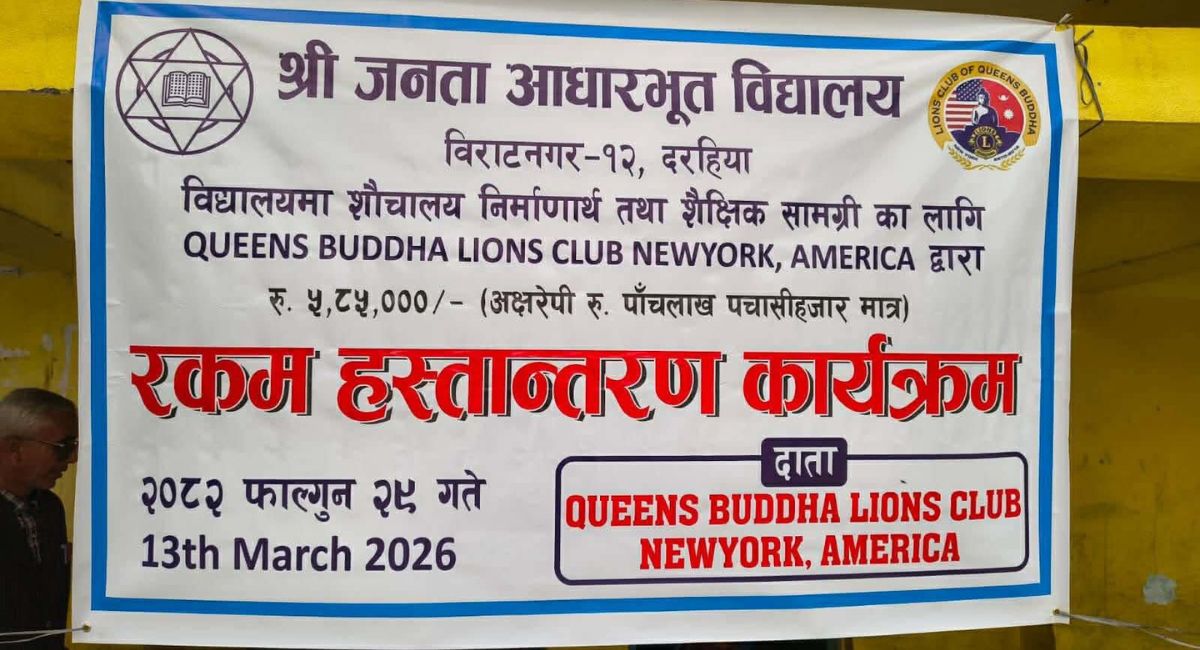 न्युयोर्क- शिक्षा, शौचालय निर्माण र सरसफाइ क्षेत्रको सुधारका लागि महत्त्वपूर्ण योगदान स्वरूप लायन्स क्लब अफ क्वीन्स बुद्धले विराटनगर–१२ स्थित जनता आधारभूत विद्यालयलाई रु. ५,८५,००० (पाँच लाख पचासी हजार रुपैयाँ) सहयोग प्रदान गरेको छ। उक्त सहयोग विद्यालयको शिक्षा, शौचालय निर्माण र सरसफाइ क्षेत्रको सुधारका लागि प्रदान गरिएको हो।